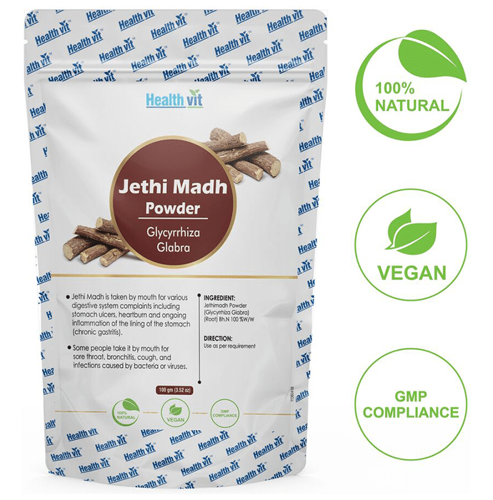 HealthVit Natural Jethi Madha Powder (Glycyrrhiza Glabra) Powder Healthvit Jethi madha powder contains powder of Jethi madha/liquorice (Glycyrrhiza glabra ) as its ingredient. Key benefits of Healthvit Jethi madha powder: Protects the liver and promotes healing in this vital organ. Its anti-inflammatory properties help calm hepatitis-associated liver inflammation. It also fights the virus commonly responsible for hepatitis and supplies valuable antioxidant compounds that help maintain the overall health of the liver. Treat PMS (Premenstrual syndrome) and menstrual problems. Direction for use: Mix one teaspoonful of this powder in 200ml of or as directed by the physician. Safety information: Pregnant or lactating women are adviced to consume herbal products under the advice of the physician. No artificial colour, flavours or preservatives added, no chemical solvents. Use under medical supervision.