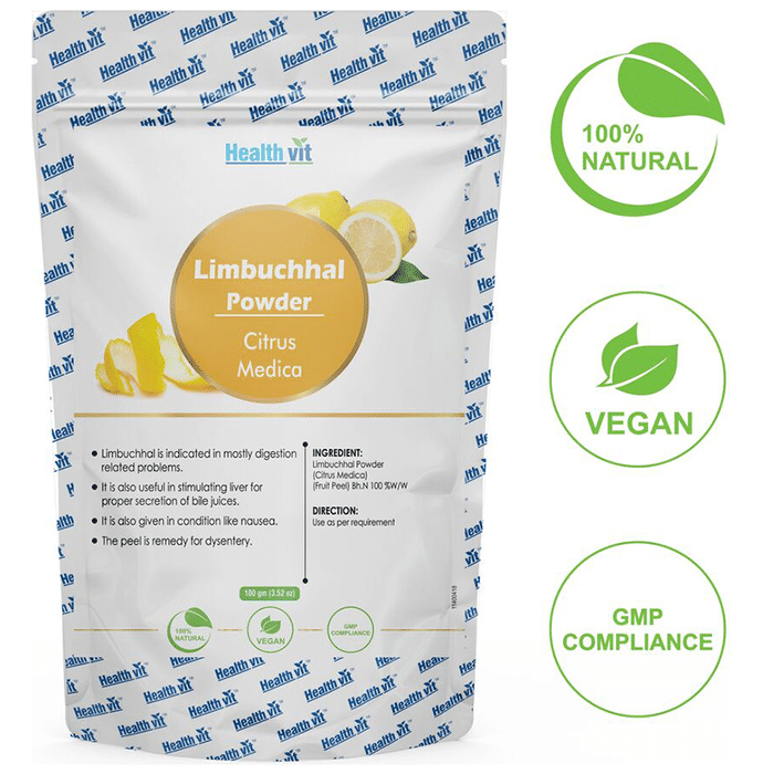 HealthVit Natural Limbuchhal (Citrus Medical ) Powder Healthvit Limbuchhal powder contains powder of limbuchhal /lemon (Citrus medica) as its ingredient. Key benefits of Healthvit Limbuchhal powder: It is indicated in mostly digestion related problems. It also acts in stimulating liver for proper secretion of bile juices. It is also given in conditions like nausea. Its peel is a remedy for dysentery. Direction for use: Mix one teaspoonful of this powder in 200ml of or as directed by the physician. Safety information: Pregnant or lactating women are adviced to consume herbal products under the advice of the physician. No artificial colour, flavours or preservatives added, no chemical solvents. Use under medical supervision.