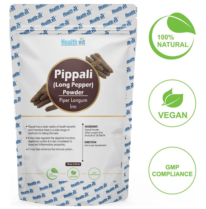 HealthVit Natural Pippali (Piper Longum linn) Powder Healthvit Pippali powder contains powder of pippali (Piper longum inn.) as its ingredient. Key benefits of Healthvit Pippali powder: It may help regulate the digestive functions, respiratory system. It is also considered to have anti inflammatory properties. It may help enhance the immune system. Direction for use: Mix one teaspoonful of this powder or as directed by the physician. Safety information: Pregnant or lactating women are adviced to consume herbal products under the advice of the physician. No artificial colour, flavours or preservatives added, no chemical solvents. keep out of reach o children. Use under medical supervision.