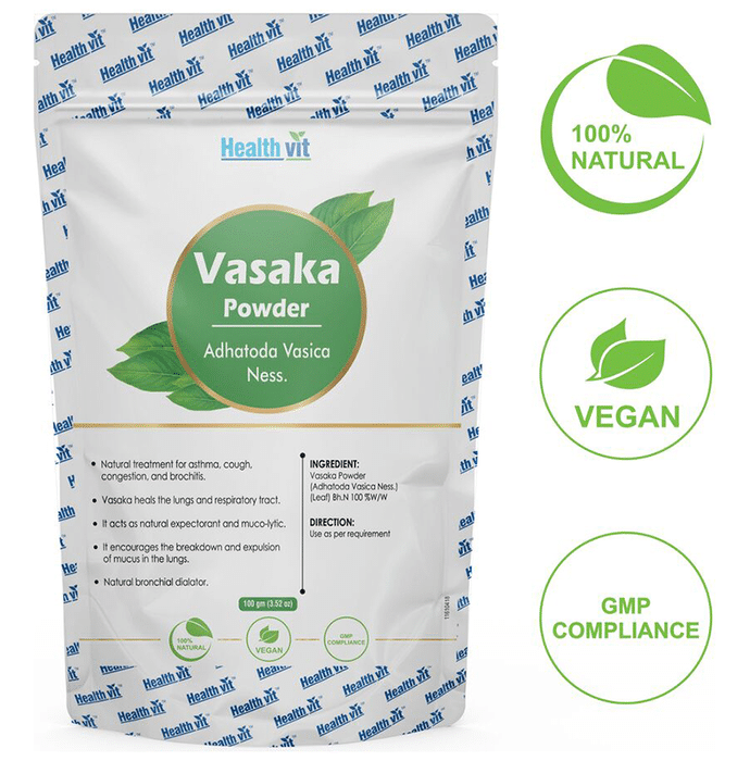 HealthVit Natural Vasaka (Adhatoda) Powder Healthvit Vasaka powder contains powder of Vasaka (Adhatoda vasica Nees.) as its ingredient. Key benefits of Healthvit Vasaka powder: It helps to extract extra kapha (water) from chest and helps in comfortable breathing. It act as tonic for respiratory and circulatory system. It also helps to enhance the formation of healthy body tissues. Helps in improvement of tightness of chest due to extra mucous in chest. Direction for use: Mix one teaspoonful of this powder or as directed by the physician. Safety information: Pregnant or lactating women are adviced to consume herbal products under the advice of the physician. No artificial colour, flavours or preservatives added, no chemical solvents. keep out of reach o children. Use under medical supervision.