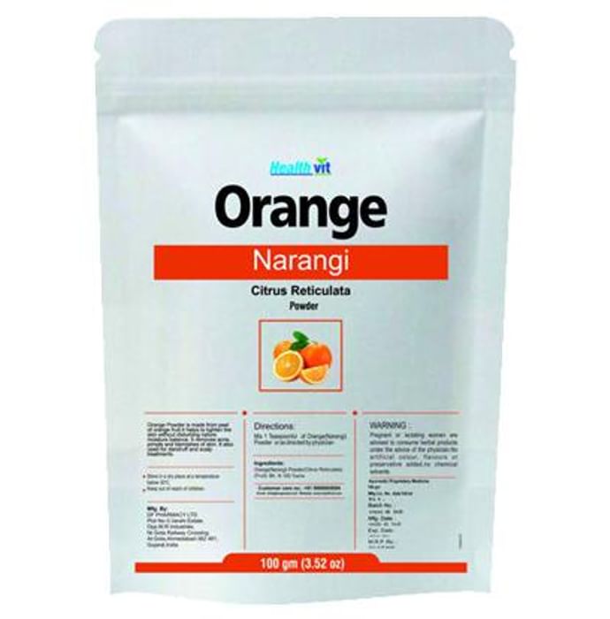 HealthVit Orange Powder Healthvit Orange powder contains powder of orange peel (Citrus reticulate) as its ingredient. Key benefits of Healthvit Orange powder: It helps to tighten the skin without disturbing natural moisture balance. It removes acne, pimple and blemishes of skin. It also used for dandruff and scalp treatments. Direction for use: Mix one teaspoonful of this powder or as directed by the physician. Safety information: Pregnant or lactating women are advised to consume herbal products under the advice of the physician. No artificial colour, flavours or preservatives added, no chemical solvents. keep out of reach o children. Use under medical supervision.