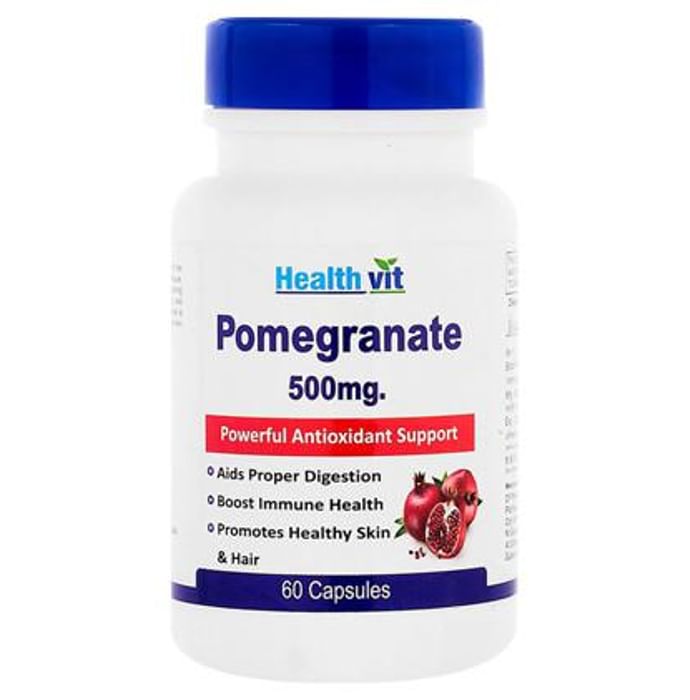HealthVit Pomegranate 500mg Capsule Healthvit Pomegranate 500mg capsule contains pomegranate seed extract as its main ingredient. It is used for conditions of the head and blood vessels, including high blood pressure, congestive head failure, hardening of the digestive track including diarrhea, dysentery and tapeworm and other intestinal parasite. Key benefits of Healthvit Pomegranate 500mg Capsule: Aids proper digestion. Boost immune health. Promotes healthy skin & hair. Direction of use: As a dietary supplement, take one capsule two three times daily, 30 minutes before meal with water. Safety information: Pregnant, nursing women or individual taking any medications should consult the doctor before use. Keep out of reach of children. Use under medical supervision.