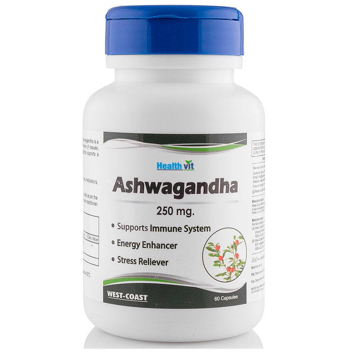 HealthVit Pure Ashwagandha Root Powder 250mg Capsule HealthVit Ashwagandha 250mg capsules contains Ashwagandha powder (withania somnifera) as its main ingredient. Ashwagandha is a unique antioxidant herb with anti-stress action which helps to cope with life’s daily stress. It helps in regulating thyroid, stimulates the immune system and improves the memory. Key benefits of HealthVit Ashwagandha 250mg capsules: It possess good antioxidant property. Work as mood stabilizer. Provide power to the muscle and stamina to the body. Effective against joint inflammation, ageing, diabetes, chronic fatigue syndrome. Removes exhaustion & general disability. Act as immunosuppressent. It is a good mood stabilizer. Helps in reducing swelling. Restores blood supply. Direction for use: Take 2 capsules once a day before meals. Safety information: Pregnant, nursing women or individual taking any medications, consult the doctor before use. No artificial colour, flavours or preservatives added, no chemical solvents. Use under medical supervision.