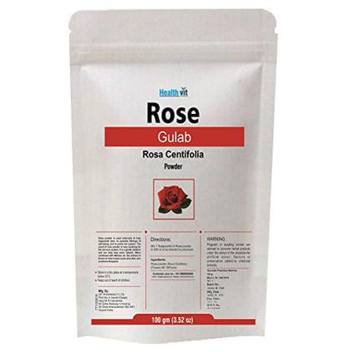 HealthVit Rose Petal Powder Healthvit Rose Petal powder contains powder of rose petal (Rosa centifolia) as its ingredient. Key benefits of Healthvit Rose Petal powder: Rose powder is used externally to help regenerate skin, to promote feelings of well-being, and to purify the system. The scent of rose powder is very soothing for the nervous system. It is a gentle sedative and can help stop panic attacks. When combined with melissa oil, the mixture is known to help herpes sores and other skin eruptions disappear. Direction for use: Mix one teaspoonful of this powder in 200ml of as directed by the physician. Safety information: Pregnant or lactating women are advised to consume herbal products under the advice of the physician. No artificial colour, flavours or preservatives added, no chemical solvents. keep out of reach o children. Use under medical supervision.