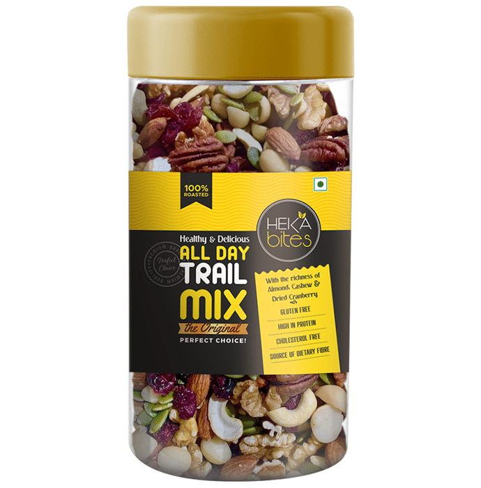 Heka Bites Healthy & Delicious All Day Trail Mix Heka Bites Trail Mix is a delicious mixture of nuts and seeds that provide great taste and nutrition. It is a perfect fusion of seeds and nuts like sunflower seeds, pumpkin seeds, watermelon seeds, cashews, almonds, cranberries, and raisins, making it the perfect snack to much on to satisfy your hunger pangs anytime and anywhere! Enriched with the power of protein, fibre, and carbohydrates, Heka Bites Trail Mix will give you a boost of energy throughout the day and help you maintain your overall health.