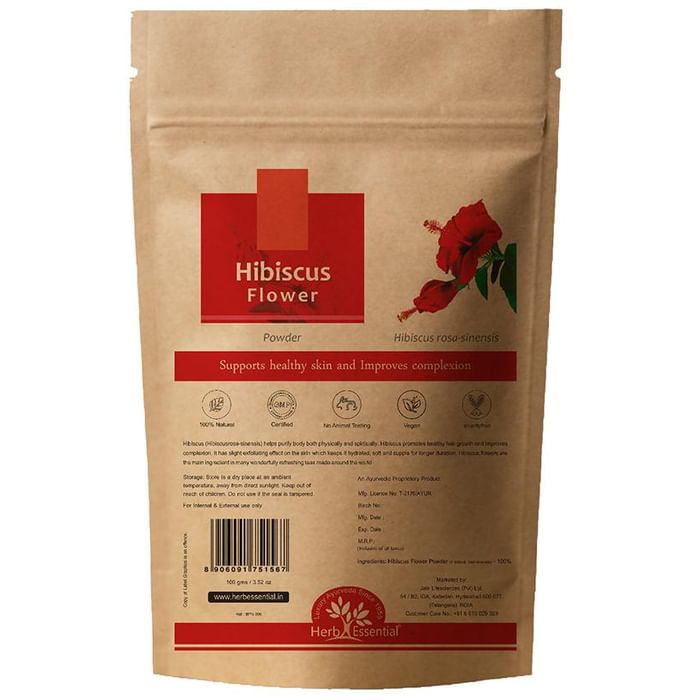 Herb Essential Hibiscus Flower Powder helps to preserve skin and hair health, as well as cognitive abilities. It contains hibiscus flower powder, which aids in digestive system improvement and constipation relief. It also aids in weight loss, the efficient absorption of glucose from food, and preventing red blood cell deficits in the blood. | Key Ingredients: Hibiscus flower powder | Key Benefits: It is beneficial for maintaining skin and hair health and aids in cognitive functions It contains hibiscus flower powder, which helps in improving the digestive system and also aids in easing constipation It also helps in weight loss, aids in the efficient absorption of glucose from the food and also prevents the deficiency of red blood cells in the blood | Directions For Use: Use as directed on the label or as advised by the physician. | Safety Information: Read the label carefully before use Do not exceed the recommended dosage Store in a cool and dry place away from direct sunlight Keep out of reach of children
