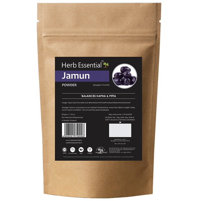 Herb Essential Jamun (Syzygium Cumini) Powder Herb Essential Jamun Powder is hygienically extracted from pure jamun. It is a natural blood purifier which makes it perfect for regulating blood sugar levels. It has rich iron content. Key benefits of Herb Essential Jamun Powder: It helps in digestion. It regulates metabolism. It is perfect for diabetic patients. It is an excellent source of all essential nutrients. It improve glucose tolerance without increasing blood insulin levels. It improve energy and stamina level. It also help to build immune system and increase body's resistance against infection. Improves muscles and tissues. It helps prevent excess sugar absorption. It help in treating urinary disorders. Direction of use: Take 1 teaspoon mixed with water twice a day or as directed by physician. Usen under medical supervision.