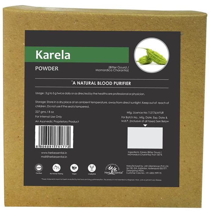 Herb Essential Karela (Momordica Charantia) Powder Herb Essential Karela Powder is hygienically extracted from pure karela. It is a natural blood purifier which makes it perfect for regulating blood sugar levels. It has rich iron content. Key benefits of Herb Essential Karela Powder: It helps in digestion. It regulates metabolism. It is perfect for diabetic patients. It is an excellent source of all essential nutrients. It improve glucose tolerance without increasing blood insulin levels. It improve energy and stamina level. It also help to build immune system and increase body's resistance against infection. It helps prevent excess sugar absorption. Direction of use: Take 1 teaspoon mixed with water twice a day or as directed by physician. Use under medical supervision.