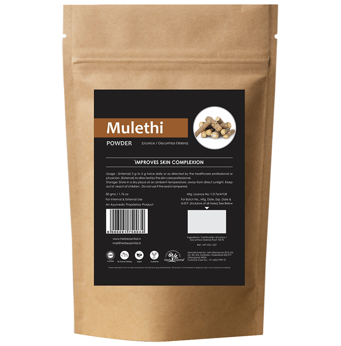 Herb Essential Yastimadhu/Licorice/Glycyrrhiza Glabra Powder Herb Essential Yastimadhu Powder contains powder of liquorice (glycyrrhiza glabra). Key benefits of Herb Essential Yastimadhu Powder: Strengthens muscles and bones. Treats acid peptic disorder, treats duodenal ulcers & gastro esophageal reflux disorder. Increases physical strength. Enhances glycoprotein synthesis. Treats arthritis and rheumatism. Direction for use: Take 3 to 5 gm once or twice a day or as directed by the physician. Safety information: Keep out of the reach of children. Use under medical supervision.