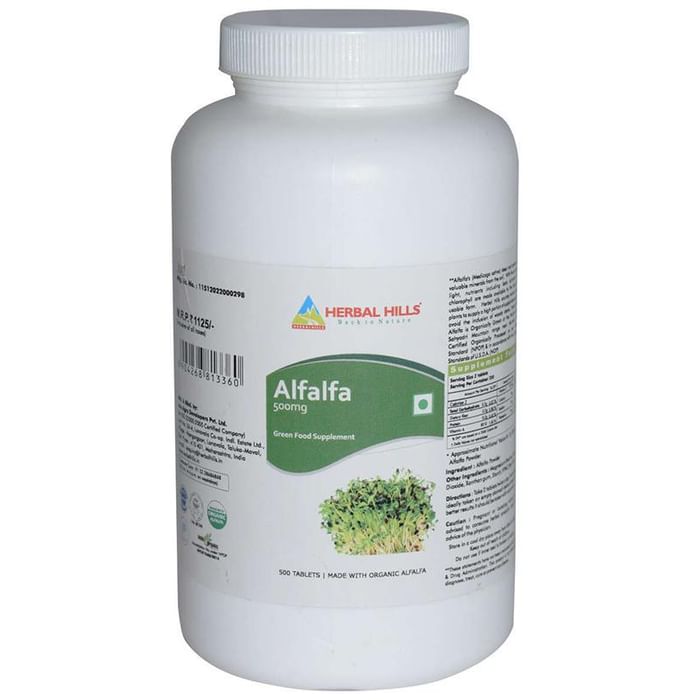 Herbal Hills Alfalfa 500mg Tablet Herbal Hills Alfalfa Tablet contains Alfalfa (Medicago sativa) as an active ingredient. Key benefits/uses of Herbal Hills Alfalfa Tablet: - Acts as excellent nutrient as it is rich in various types of minerals like Calcium, Magnesium, and Vitamins like Vitamin E & Vitamin C which are beneficial for health - Useful in the improvement of blood circulation of the body & maintains the healthy cholesterol levels in the body - Acts as an excellent nutrient which is beneficial for the metabolic activities of the body - Used in the treatment of diabetes - Used in the liver detoxification, and helps the body to remove toxins - Used to treat stomach ulcer and also used as a remedy for various stomach problems such as constipation, diarrhea, indigestion, and flatulence - Useful for the treatment of blood pressure - Beneficial for the imbalanced skin conditions, and increases the immunity of the body - Improves appetite and digestion so beneficial for the treatment of anorexia - Acts as an anti-inflammatory and used to treat arthritis, rheumatism, gout and other muscle and joint inflammations - Beneficial for the treatment of anemia - Promotes hair growth and stop hair fall Directions for use/Dosage: Take 2 tablets twice daily for maintaining good health or as directed by the physician Safety information: - Read the label carefully before use - Do not exceed the recommended dose - Keep out of the reach and sight of children