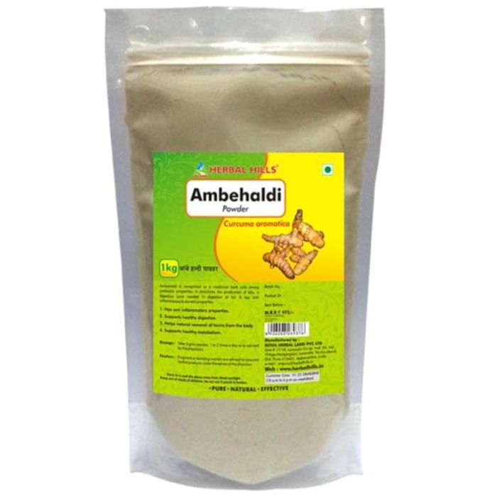 Herbal Hills Ambehaldi Powder Herbal Hills Ambehaldi Powder contains Ambehaldi (Curcuma aromatica powder) as the active ingredient. Key benefits/uses of Herbal Hills Ambehaldi Powder: Role of active ingredient: Ambehaldi (Curcuma aromatica powder): - Stimulates the production of bile, a digestive juice needed in the digestion of fat - Contains anti-inflammatory & diuretics properties - Supports the healthy digestion in the body and metabolic activities - Helps in the natural removal of toxins from the body - Acts as anti-tussive and provides relief from a cough - Helps to fight free radical damage which is responsible for premature aging of the skin and body due to its antioxidant properties - Reduces the growth of tumor and cancer cells when taken internally - Possess nephroprotective properties and wound healing properties - Useful for the treatment of acne, scars, unwanted hair removal, eczema, hyperpigmentation, dark circles, pimples, skin whitening (lightens spots and scars) and for glowing skin Directions for use/Dosage: - Take 3 gms powder, 1 to 2 times a day or as advised by the physician Safety information: - Read the label carefully before use - Do not exceed the recommended dose - Keep out of the reach and sight of children