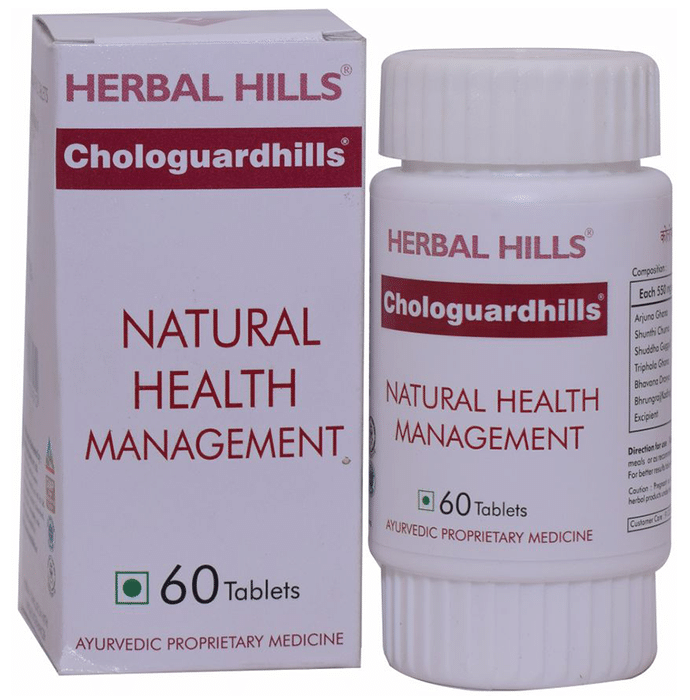 Herbal Hills Chologuardhills Tablet Herbal Hills Chologuardhills Tablet contains Arjuna, Shuddha Guggul, Sunthee, Triphala, and Bhrungraj as active ingredients. Key benefits/uses of Chologuardhills: Role of active ingredients: - Arjuna: Used as a Cardiac tonic and its astringent activity helps in strengthening the cardiac muscles & blood vessels - Guggul: Acts as a potent anti-lipidemic and also helps in protection of vessels from the formation of plaque - Triphala: Has cleaning & bowel toning property, removes and maintains lipid metabolism - Sunthee: Thins the blood and dissolves blood clots.It also inhibits platelet clumping, so protects from various heart problems and also acts as an anti-inflammatory - Bhrungraj: Improves blood circulation to the heart, lowers cholesterol, improves triglyceride levels and regulates blood pressure levels Directions for use/Dosage: - Take 1 tablet of Herbal Hills Chologuardhills twice daily after meals or as directed by the physician Indication: - Cardiovascular disorders Safety information: - Read the label carefully before use - Do not exceed the recommended dose - Keep out of the reach and sight of children"