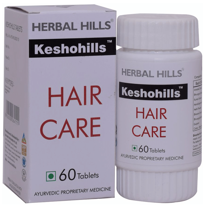 Herbal Hills Keshohills Hair Care Tablet Keshohills tablets contain Amalaki, Kumari, Bhrungraj, Mandukparnee, Methi and Bhavana dravya as active ingredients. Key benefits/uses of Keshohills tablets: - Acts as an excellent tonic to the hair and scalp - Promotes growth of hair and helps control hair fall - Enhances hair pigmentation and delay premature graying - Promotes normal pigmentation of hair - Acts as excellent anti-inflammatory agent and treats scalp dandruff Directions for use/Dosage: - Take 1 tablet twice daily after meals or as directed by the physician Indication: - Haircare Safety information: - Read the label carefully before use - Do not exceed the recommended dose - Keep out of the reach and sight of children"