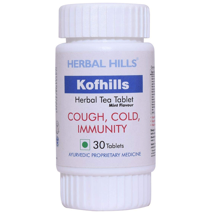 Herbal Hills Kofhills Mint Tablet Herbal Hills Kofhills Tablet contains Kali Miri fruit powder, Dalchini Bark powder, Lavang fruit powder, Jaiphal fruit powder, Elaichi powder, Sunthee powder, Badi Elaichi fruit powder, Yashtimadhu Bark powder, and Lemongrass leaves powder as active ingredients. Key benefits/uses of Herbal Hills Kofhills Tablet: - Manages healthy Immunity - Helps to maintain healthy Respiratory System - Helps in clearing throat irritation and cough - Possess antibacterial and antifungal property that helps to cope with a cough, cold and flu symptoms Directions for use/Dosage: - Take 1 tablet 2 to 3 times a day. - Place one tablet of Kofhills into a cup then add very hot water, stir and add milk to taste if desired or use as directed by the physician. Indication: Cough, Cold Safety information: - Read the label carefully before use - Do not exceed the recommended dose - Keep out of the reach and sight of children