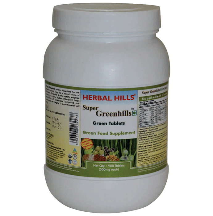Herbal Hills Super Greenhills Green 500mg Tablet Herbal Hills Super Greenhills Tablet contains ingredients to provide nutrition and healing. It contains high amount of Chlorophyll, Flavonoids & some specific enzymes. Super Greenhills contains an assortment of nutrient rich food such as Wheatgrass, Barley grass, Alfalfa, Spirulina, flax seeds, Sesame seeds, sunflower seeds designed as nutrition support to your daily diet. Wheatgrass rich in chlorophyll a complete food, Immune & energy booster & excellent blood tonic. Barley grass contains fibre and oil that may help to lower cholesterol.