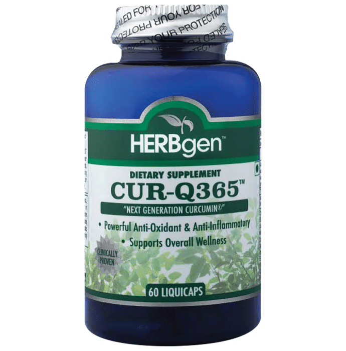 Herbgen Cur-Q365 Liquicap Herbgen Cur-Q365 Liquicap aids in the enhancement of joint and brain health as well as enhancing the immune system of the body. It promotes healthy cardiovascular functioning and increases antioxidant levels in the body, protecting it from free radical damage. It contains turmeric ingredients, which assist to decrease cholesterol and prevent skin problems like scarring. Curcumin has been shown to help with inflammatory bowel disease, pancreatitis, and arthritis, among other conditions.