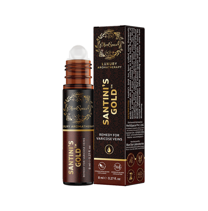 Herbspace Santini's Gold Remedy for Varicose Veins Oil Herbspace Santini's Gold Oil has been crafted using therapeutic grade essential oils blended carefully to bring forth the power of plants to address all areas related to varicose veins. This blend strengthens blood capillaries, improves blood circulation and decongests thick and stagnant blood to restore the normal flow of blood.