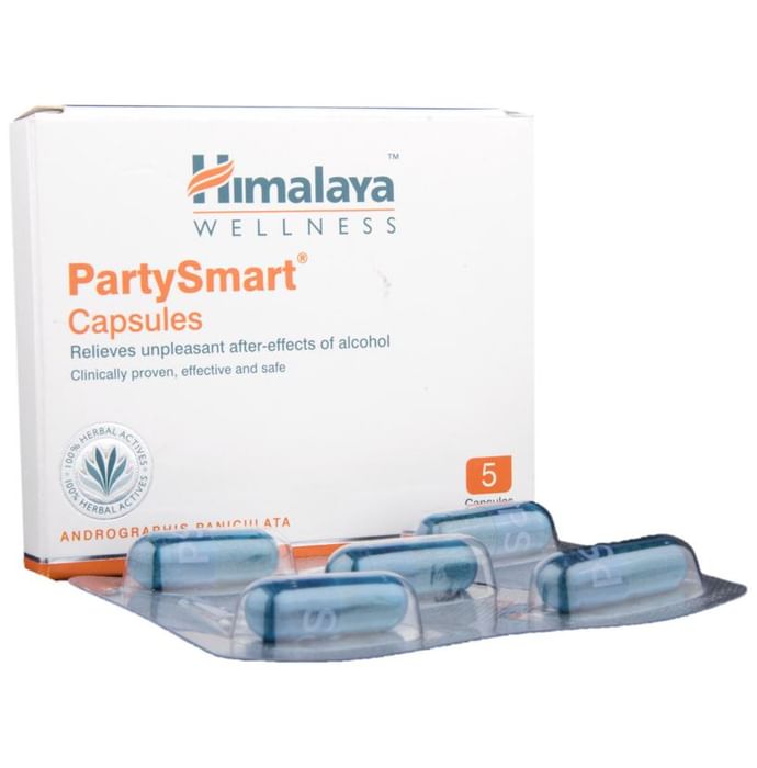 Himalaya Wellness PartySmart Capsule Himalaya Wellness PartySmart Capsule capsules contain a mixture of chicory(kasani) and dates (kharjura). Chicory (kasani) exhibits anti-inflammatory activity and protects the gastric mucosa from alcohol-induced disturbances. Dates (kharjura) possess potent antioxidant property, which inhibits oxidative damage caused by superoxide and hydroxyl radicals, thus helping relieve the after-effects of alcohol consumption. Himalaya party smart capsules are the ideal hangover solution. It is ideal for after-effects of alcohol headache, nausea and vomiting, drowsiness, fatigue and body ache burning sensation in the stomach. It provides quick and effective relief from the effects of a hard night of drinking. PartySmart prevents the adverse effects of alcohol by rapidly eliminating acetaldehyde from blood. The drug eliminates acetaldehyde by increasing ADH (alcohol dehydrogenase) and ALDH (aldehyde dehydrogenase) activity.