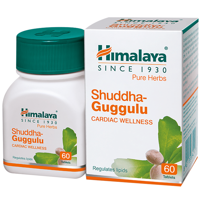 Himalaya Wellness Pure Herbs Shuddha Guggulu Cardiac Wellness Tablet contains Shuddha Guggulu, Guggulsterones, which help regulate critical biochemical steps in the liver and intestines that decrease cholesterol uptake. | Key Ingredients: Shuddha Guggulu (Commiphora wightii) | Key Benefits: Guggulsterones increase the conversion of cholesterol into bile acids, facilitating removal of excess cholesterol through feces Helps lower LDL (low density lipoprotein) cholesterol levels significantly Prevents clogging and hardening of blood vessels (atherosclerosis) by stopping the oxidation of bad cholesterol (LDL) Supports healthy weight by regulating metabolism and enhancing thyroid function Shudha guggulu is ideal for increased lipid levels (hyperlipidemia) | Directions For Use: Use as directed by the physician. | Safety Information: Read the label carefully before use Store in a cool dry place away from direct sunlight Keep out of reach of the children Use under medical supervision