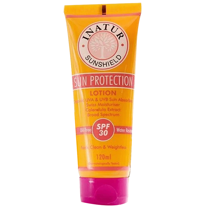 Inatur Sunshield Sun Protection Lotion SPF 30 Inatur Sunshield Sun Protection Lotion Spf 30 is a water-resistant sunscreen lotion that is perfect for harsh summers, by providing the necessary clinically proven skin protection against sun damage.