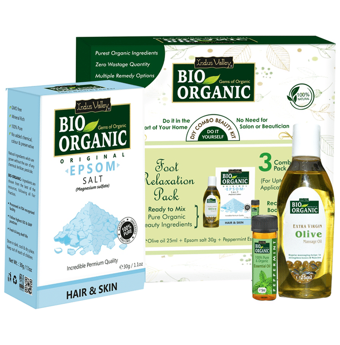 Indus Valley Bio Organic Foot Relaxation Pack DIY Combo Beauty Kit is a powerful combination of nature’s best ingredients that give long-term relief from foot muscle soreness, stiffness and pain. Being a mineral-rich organic foot soak, it will massage your foot muscles inside out and also help in healing stubborn cracked heels by softening up the hardened dead tissues and scraping them away with just a few applications, removing all dirt and accumulation, giving you softened, elegant soles. Both the oils in the foot soak are certified organic by ECOCERT, USDA Organic, India Organic and certified as edible by FSSAI, Epsom salt is 100% natural. | Key Ingredients: Epsom salt Peppermint essential oil Olive massage oil | Key Benefits: A relaxing, all-natural and organic foot relaxation kit Helps relieve you of muscle pains and cramps It will gently scrape away stubborn dead cell accumulations on your heels to quickly relieve you of cracked heels A mineral-rich composition that will massage your foot soles and skin inside out | Directions For Use: Take half a tub of water and put 2 spoons of Epsom salt, and 5-8 drops of peppermint oil Mix well and soak feet in the tub for 10-15 mins for relalxation Always use freshly made mixture and discard the leftover mixture after use Dry the feet with a towel and apply olive oil for deep moisturization | Safety Information: Not for internal use Read the label carefully before use Store in a cool and dry place away from direct sunlight Keep out of reach of children