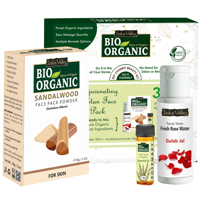 Indus Valley Bio Organic Rejuvenating Ubtan Face Pack DIY Combo Beauty Kit helps to pamper your skin inside out and look fresher, younger, healthier and more glowing each day. A naturally healthy and glowing skin makes all the difference when it comes to looking good and fresh. Super-enriched with skin caring exotic ingredients, this rejuvenating and revitalizing face pack will soothe your skin, deeply hydrate it and make your complexion fairer, your skin texture more even-toned, tighter and more elastic with each application. The rejuvenating ubtan face pack price is also extremely budgeted. A single kit will give you up to 20 applications, thereby costing you only INR 12.45 per application. | Key Ingredients: Sandalwood face pack powder Rose water Rosemary essential oil | Key Benefits: This face pack will soothe your skin, moisturize it, clean up clogged pores and detoxify the skin Reduces suntan, excess pigmentation, blackheads, dark circles and spots, and gives you an even-toned, silky, smooth skin Reduces wrinkles and fine lines, tightens loose skin, reduces under-eye puffiness and makes your skin more elastic and tight Rose Water and Multani Mitti will shrink up large open pores | Directions For Use: Take 1/4th spoon of sandalwood face pack, 1/2 spoon of fresh rose water and add 2-3 drops of rosemary oil Mix well and apply on face Allow it to dry and then rinse well with water Always use a freshly made mixture, discard the leftover mixture after use | Safety Information: Not for internal use Store in a cool and dark place away from direct sunlight Keep out of reach of children