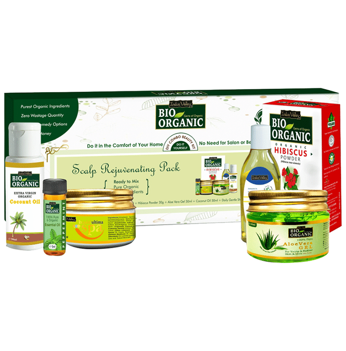 Indus Valley Bio Organic Scalp Rejuvenating Pack DIY Combo Beauty Kit is a special formulation that cleanses, detoxifies and nourishes the scalp. A healthy scalp promotes the growth of healthy hair. It removes all accumulated dirt, oil and grime from the scalp, kills away bacteria and fungus, then packs a punch of nutrition into the hair roots to make them grow longer, stronger and healthier. The pack ingredients are certified organic by USDA Organic, ECOCERT and India Organic. | Key Ingredients: Hibiscus powder Aloe vera gel Coconut oil Peppermint essential oil Daily gentle shampoo Hair ultima spa | Key Benefits: This DIY hair pack will strengthen your hair roots and nourish your scalp to stimulate new hair growth It will remove dead skin cells, dirt, oil and grime trapped inside your scalp pores Helps in detoxifying the scalp by killing bacteria and fungus buildups and clearing away dandruff and eczema It will moisturize, condition and nourish your hair and scalp Powerful antioxidants help counter free-radical buildups to reduce hair loss and keep hair shiny and bouncy | Directions For Use: Take 2 spoons of hibiscus powder, 1 spoon of aloe vera gel, 1 spoon of coconut oil, and 10 drops of peppermint oil to make a paste Mix the paste until it has a honey-like consistency Wet your hair and then apply the paste on hair and scalp thoroughly Leave it for a minimum of 30 minutes Always use freshly made mixture and discard the leftover mixture after use Rinse off the paste with running water followed by Daily Gentle shampoo For regeneration of hair, apply ultima spa Leave it for a minimum of 15-20 minutes Rinse off with water | Safety Information: Not for internal use Read the label carefully before use Store in a cool and dry place away from direct sunlight Keep out of reach of children