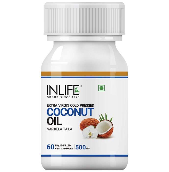 Inlife Extra Virgin Cold Pressed Coconut Oil Filled Capsule is the latest form of coconut oil consumption. Inlife coconut oil vegetarian capsules are like any other health supplement capsules, having a concentrated form of pure, extra virgin cold-pressed coconut oil encapsulated in hard-shelled HPMC capsules. | Key Ingredients: 500 mg coconut oil in each capsule. | Key Benefits: Coconut oil is nature's answer to all skin and hair related problems It is rich in MCT that helps in weight management It is a completely vegetarian product and works well for the keto diet Its natural antibacterial, anti-fungal and antiviral properties help in treating acne, pimples, inflammation and eczema The deep nourishing property of coconut oil makes it an ideal moisturizer for dry and flaky skin It is used to treat problems of hair fall, dry scalp, dandruff, brittle hair and split ends Vitamin E and Lauric Acid present in the oil reduces the effects of free radicals and oxidative stress for a youthful and supple skin | Directions For Use: Take one capsule 2 to 3 times a day or as advised by the healthcare professional. | Safety Information: Read the label carefully before use Do not exceed the recommended dosage Keep out of reach of children Store in a cool and dry place away from direct sunlight