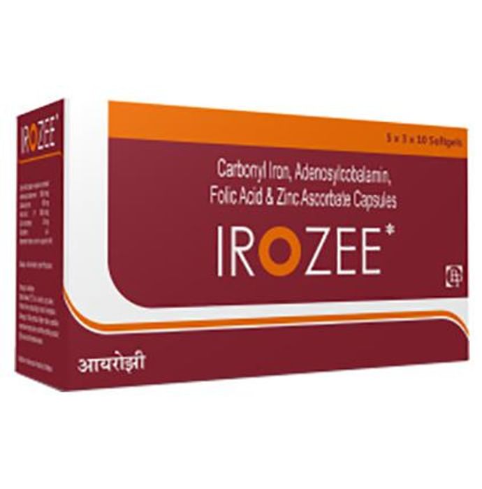 Irozee Capsule is a health supplement that helps prevent iron deficiency and iron deficiency anaemia. It helps prevent nutritional deficiency and aids proper functioning and growth of the body. | Key Ingredients: Adenosylcobalamin Carbonyl Iron Folic acid Zinc | Key Benefits: It helps improve energy levels It eliminates weakness and fatigue Folic acid aids in the production of red blood cells Zinc ensures optimal growth and development of the body | Directions For Use: Use as directed on the label | Safety Information: Read the label carefully before use Store in a cool and dry place, away from sunlight Keep out of reach of children