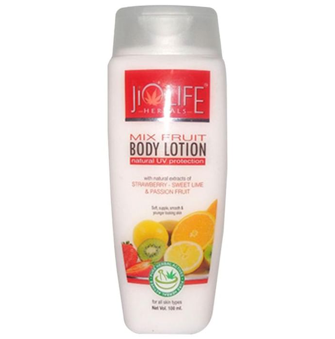 Jiolife Mix Fruit Body Lotion Jiolife Mix Fruit Body lotion with natural extracts of Strawberry Sweet Lime & passion fruit is luxurious and rich moisturizing body lotion with powerful antioxidants and moisturizers. The moisturizer maintains the moisture level of the skin and deeply hydrates the skin from within. It maintains the pH balance of the skin. The moisturizer soothes and heals inflamed and irritated skin. It visibly reduces the dark spots, scars and blemishes. Conditions and nourishes skin and makes skin soft smooth & supple, well lubricated & younger looking.