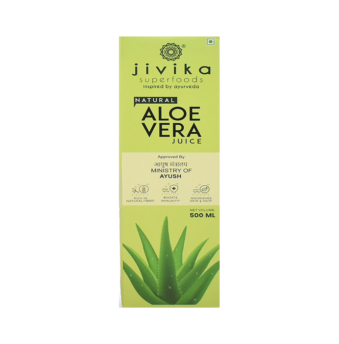 Jivika Naturals Aloe Vera Juice is formulated with fresh aloe vera plants sourced from Rajasthan and produced in small batches, ensuring the highest quality and nutrition. Aloe vera is said to have multiple benefits on your body, starting from the hair, skin and digestion. It is loaded with vitamins, minerals, and antioxidants, and it also has anti-inflammatory properties in it. It boosts metabolism and detoxifies your body. It also helps improve digestion and reduces acidity problems. Aloe vera juice is also included in diets for maintaining a balanced weight. As for your skin, it has hydrating properties, which help reduce dryness and acne scars and also help reduce scalp inflammation. It strengthens the roots and gives you shiny and luscious hair. | Key Ingredients: Aloe vera | Key Benefits: It is common knowledge that aloe vera applied directly is a great way to moisturise and protect your skin from damage, but consuming the juice is also incredibly beneficial for maintaining radiant and healthy skin Regular consumption of aloe vera can improve skin elasticity and help your skin age gracefully Aloe vera juice is rich in anthraquinone glycosides, which can act as a natural laxative Aloe vera can also deal with conditions such as GERD and irritable bowel syndrome Aloe vera juice is the perfect way to detox your blood, skin and digestive tract. It is rich in antioxidants, which help cleanse the body and combat free radicals Furthermore, aloe vera juice provides a great boost to your immune system | Directions For Use: As mentioned on the label Or as advised by your healthcare practitioner | Safety Information: Read the label carefully before use Store in a cool and dry place, away from sunlight Keep out of reach of children
