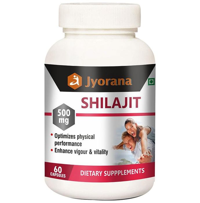 Jyorana Shilajit 500mg Capsule is formulated with ayurvedic herb shilajit. It has Aphrodisiac properties and helps in improving testosterone level and enhance male fertility. It is useful in relieving fatigue and tiredness. It has a rejuvenating effect on the body and has antioxidant and anti-inflammatory properties.It is also useful in reducing the signs of ageing. | Key Ingredients: Shilajit | Key Benefits: Helps in reducing fatigue Aids in improving sexual stamina Beneficial in enhancing testosterone level and fertility Reduces the risk of Alzheimer's disease Decreases signs of ageing | Directions For Use: Use as directed by the physician. | Safety Information: Read the label carefully before use Keep out of the reach of children Keep the container tightly closed Do not use if the seal is broken Do not exceed the recommended dosage Store in a cool and dry place, away from direct sunlight