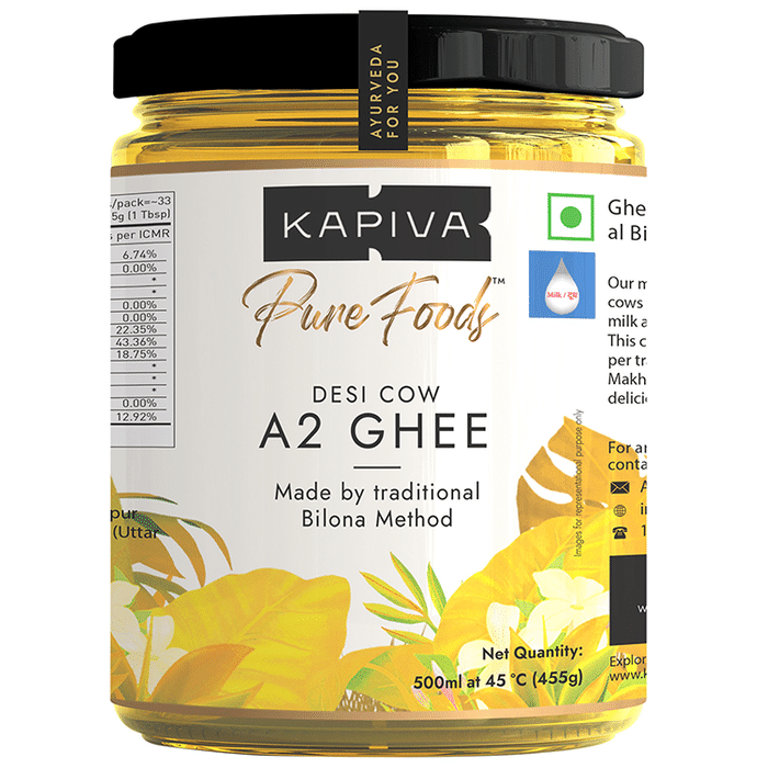 Kapiva A2 Desi Cow Ghee is procured from the milk of the Tharparkar cows - which are a cow breed indigenous to the Thar Desert. These grass-fed cows are not factory-farmed and are free from cross-breeding. This desi ghee is made from curd and not cream. The process involves boiling raw, unprocessed A2 cow milk and then, converting it to curd in a clay pot. Furthermore, the curd is hand-churned (from the boiled milk) to help retain the nutrients. The final step is separating the butter to form the ghee. This Indian Ghee comes in glass bottles and has a shelf life of 2 years from the date of manufacturing. | Key Ingredients: A2 Milk | Key Benefits: The A2 milk which is used to make this organic ghee contains beta-casein protein that's supremely rich in nutrients such as calcium, iron, sodium and fat-soluble vitamins A, D and E, as well as Omega-3 and Omega-6 fatty acids Grass-fed Cows Ghee contains good fats, can be easily digested by the body and is suitable for kids With healthy fats, this ghee helps to maintain a healthy heart with good cholesterol in the body Stimulates the digestion of stomach acids, whereas other fats and oils might delay the digestive process Meets 90% of your daily omega-3 fatty acid requirement Building desi ghee into a dietary staple can enhance immunity, reduce joint pain, improve bones health, treat constipation, improve heart and gall bladder functioning | Directions For Use: Make it your primary cooking fat for sauteing Swap it for butter for spreading on baked goods Use it as a substitute for butter or oil | Safety Information: Read the label carefully before use Keep out of reach of the children Store in a cool dry place