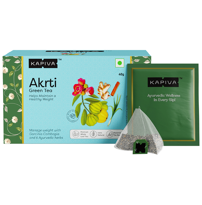 Kapiva Akrti Green Tea Bag (2gm Each) Kapiva Akrti Green Tea Bag Akrti means shape. Our green tea helps shape up your weight goals to maintain a healthy weight. It contains high-quality handpicked leaves from Assam infused with 7 Ayurvedic herbs such as Garcinia Cambogia, Lemongrass, Coleus and others. They aid metabolism and curb appetite thereby supporting weight management. These wholesome leaves are packaged in pyramid bags that offer a larger volume for the leaves to unfurl and ooze an enriching aroma and flavour.
