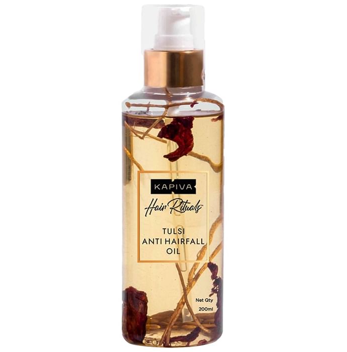 Kapiva Hair Rituals Tulsi Anti Hairfall Oil contains a blend of tulsi-based actives, ayurvedic herbs, and various herbal oils, which can help provide nutrients to the hair and combat hair fall. It addresses the causes of hair loss and may support blood circulation to the scalp and follicles. | Key Ingredients: Sesame oil, Coconut oil, Tulsi oil, Grapeseed oil, Mulethi oil, Wheatgerm oil, Thyme oil, Kalonji, Amla oil, Bhringraj oil, Brahmi oil, Almond oil, Cedarwood oil, Rosemary oil, Vitamin E, Ginger oil, Camphor oil, Coffeeseed oil, Peppermint oil, Vetiver Herb, Fenugreek Seed, Hibiscus Flower, Sunflower oil | Key Benefits: | Hair fall reduction: This hair oil contains tulsi-based actives, which can help reduce hair loss | Hair growth: The tulsi-based actives may stimulate the hair cells to help with hair growth | Volumising mist of apple stem cells: The blend of apple stem cells and protein-rich plant actives helps add volume to the hair with the help of the micro-fine mist spray bottle | Ayurvedic process: The oil is made using the Taila pak vidhi infusion process to help maintain the base oil properties and retain the benefits from the herbs | Directions For Use: Pour a sufficient amount of the oil on your palm With your fingertips, gently massage it on the roots of your hair Use thrice a week | Safety Information: Read the label carefully before use Store in a cool and dry place Keep out of reach of children