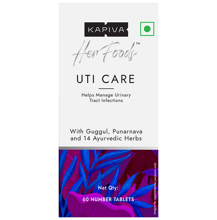 Kapiva Her Foods UTI Care Tablet It is a dietary supplement formulated with guggul, gokshura, punarnava, harad and other ingredients that help manage urinary tract infections. These herbs have analgesic, anti-inflammatory, anti-microbial properties and diuretic properties that can help reduce the risk of urinary tract infections in humans. Vitamin C in amla extract also prevents the growth of bacteria and aids in managing UTIs. | Key Ingredients: Guggul Gokshura Watermelon Tej pattra Uva ursi Cinnamon Usheer Varun chal Nagarmoth Harad Ginger Marich Pippali Baheda Amla Punarnava Triphala | Key Benefits: It is a dietary supplement that helps manage urinary tract infections These herbs have analgesic, anti-inflammatory, anti-microbial properties and diuretic properties that can help reduce the risk of urinary tract infections in humans Guggul provides relief from painful urination and inflammation Gokhru has anti-microbial properties that fight against infection-causing bacteria Vitamin C in amla extract also prevents the growth of bacteria and aids in managing UTIs Punarnava helps in removing toxins from the body due to its diuretic properties | Directions For Use: Take 1-2 tablets daily with water after meals or as directed by your physician | Safety Information: Read the product label carefully before use Store in a cool and dry place away from direct sunlight Keep out of reach of children Consult a doctor before taking any supplement Do not exceed the recommended dosage Pregnant or nursing mothers, children, and people with medical conditions must consult a physician before taking this supplement Do not use if the product appears to be tampered with or the seal is broken