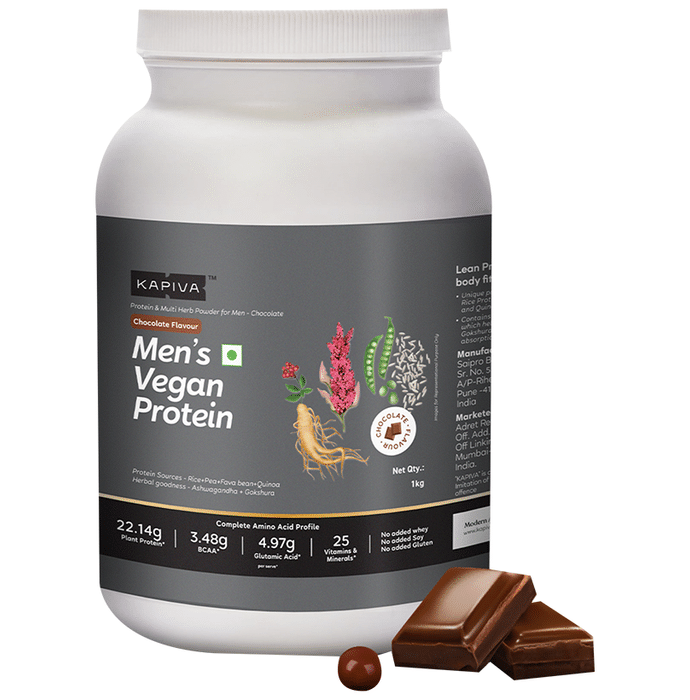 Kapiva Men's Vegan Protein Powder Chocolate contains the goodness of plant protein and Ayurvedic herbs. Get a powerful punch of 24.2 g of nutritious plant protein to fuel your fitness. With the goodness of Ayurvedic herbs namely Ashwagandha and Ginseng, this protein powder for men improves muscle support and boosts protein absorption. The low-calorie lean protein delivers 4.07g BCAA, 3.80 g glutamine and 25 essential vitamins and minerals. Its smooth texture, clean ingredients and yummy chocolate flavour make it a treat to relish. | Key Ingredients: Protein blend Rice protein isolate Fava bean protein Quinoa powder Fibre blend Cocoa powder Mineral and vitamin mix Sunflower lecithin Ashwagandha extract | Key Benefits: The low-calorie lean protein delivers 4.07 g BCAA, 3.80 g glutamine and 25 essential vitamins and minerals Its smooth texture, clean ingredients and refreshing chocolate flavour make it a treat to relish With ashwagandha and ginseng, this protein powder for men improves muscle support and boosts protein absorption Helps in gaining fat-free muscle mass and building a desirable physique | Directions For Use: Take one scoop (35 g) of vegan protein Add it to 300 ml water in a glass or shaker Stir or shake it until you have a uniform mix | Safety Information: Read the label carefully before use Keep out of reach of the children Do not exceed the stated recommended usage