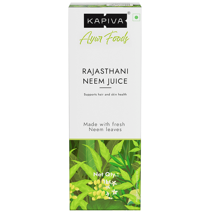 Kapiva Neem Juice useful for various reasons as it helps treat inflammation, infections, fever and certain skin diseases. It has also been known to be of use in the treatment of certain skin conditions. | Key Ingredients: Each 100ml contains: Neem (Azadirachta Indica) fr. leaf: 100% Permitted Class II Preservatives: Sodium Benzoate QS | Key Benefits: Treats indigestion, constipation and restores chemical balance in the stomach Fights hyperacidity and epigastric pain Fights intestinal worms and keeps the digestive system free of harmful parasites Treats urinary tract infection Stimulates liver function and secretion, making the blood purification process more efficient Skin disorders can be put to rest through daily consumption Acts as an anti-inflammatory and pain-relieving agent | Directions For Use: Consuming 30 ml of this juice with 30 ml of water, twice a day can work wonders for the body. | Safety Information: Read the label carefully before use Store in a cool dry place away from direct sunlight Keep out of reach of the children