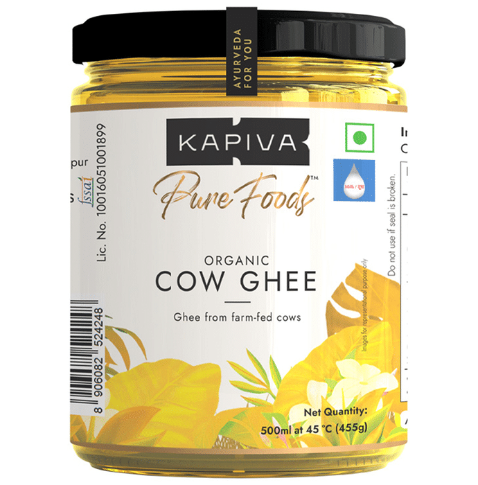 Kapiva Organic Cow Ghee is made using 100% organic milk. Usually, cows are fed processed corn feed, which affects the quality of the milk and hence the quality of the ghee. Instead, the cow milk Kapiva source is 100% organic. The cows feed only on organic, pesticide-free grass, ensuring that the quality of milk and hence the ghee, is exceptional. | Key Ingredients: Milk Fat | Key Benefits: Organic ghee increases the digestion of stomach acids, whereas other fats and oils might slow off the digestive process of the body The function of the heart and the bladder is improved It can help relieve burns or sunburns on the skin Beneficial for dry, cracked skin and may be used to moisturise and enhance hair texture The ghee soothes articular discomfort and strengthens the bones | Directions For Use: Make it your primary cooking fat for sauteing Swap it for butter for spreading on baked goods Use it as a substitute for butter or oil | Safety Information: Read the label carefully before use Keep out of reach of the children Store in a cool dry place