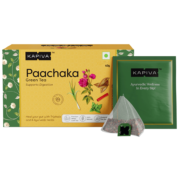 Kapiva Paachaka Green Tea Bag Paachaka literally means digestion. The nutrient properties of our tea help improve gut health. It comprises high-quality handpicked whole leaves from Assam infused with 11 digestive Ayurvedic herbs such as Triphala, Senna Leaves, Mint and many more. All of these aid digestion so you have a happy belly. The tea is packed in pyramid tea bags that offer an increased volume. This helps the tea leaves unfurl to the fullest and ooze an enriching aroma and flavour. | Key Ingredients: Green Tea 29% (Camellia sinensis) Triphala 12% Mint (Mentha spicata spp.) Lemongrass (Cymbopogon spp.) Cinnamon (Cinnamomum Verum) Liquorice (Glycyrrhiza glabra) Senna Leaves (Cassia Angustifolia) Ajwain (Trachyspermum Ammi) Rose Petals (Rosa spp.) Bay Leaf (Cinnamomum Tamala) | Key Benefits: Paachaka is a composition of 29% green tea leaves and 71% Ayurvedic herbs for optimal benefits. It contains 11 digestive Ayurvedic herbs and spices such as Triphala, bay leaf, mint, senna leaves and others. The digestive properties of these herbs promote a healthy gut. The herbs ooze an enriching aroma and flavour that uplifts your tea drinking experience The properties of each herb promote healthy digestion. Triphala soothes the stomach and rejuvenates the GI tract. Senna leaves have laxative effects that help fight constipation. Bay leaf helps detox. Further, mint stimulates digestive enzymes The Kapiva Paachaka Green Tea consists of supreme-quality, handpicked whole leaves from Assam that contain a higher amount of essential oils, antioxidants and phytonutrients. Whole leaf tea yields greater nutrition and has an enhanced flavour. The antioxidants help curb the harmful effects of free radicals on cells and maintain overall health Our whole leaves are packed in pyramid tea bags that offer extra volume that allow the tea leaves to unfurl to the fullest. These bags contain tea that is fresh, aromatic and healthier than regular tea bags | Directions For Use: Boil 180ml water and let it cool 1 minute to 90 C Pour the water into a cup and dip the teabag Brew the tea for 3-4 minutes Remove the teabag and serve hot A Single whole leaf tea bag can be used twice. Increase the brewing time by 1-2 minutes for the second infusion | Safety Information: Read the label carefully before use Keep out of reach of children Store in a cool and dry place away from direct sunlight