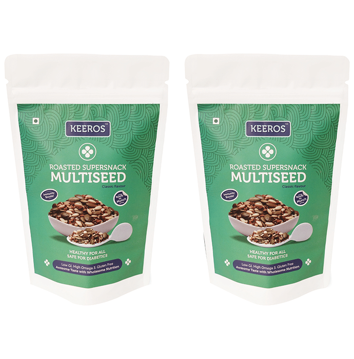 Keeros Roasted Supersnack Multiseed (400gm Each) Classic Keeros Roasted Supersnack Multigrain is Low GI, Gluten Free and Sugar-free snack backed by NABL Lab Reports that are Healthy for all and Diabetic friendly too. These seeds are free from any additive sugar that helps in maintaining the insulin level of the blood. It also eliminates unhealthy and processed foods from your diet.