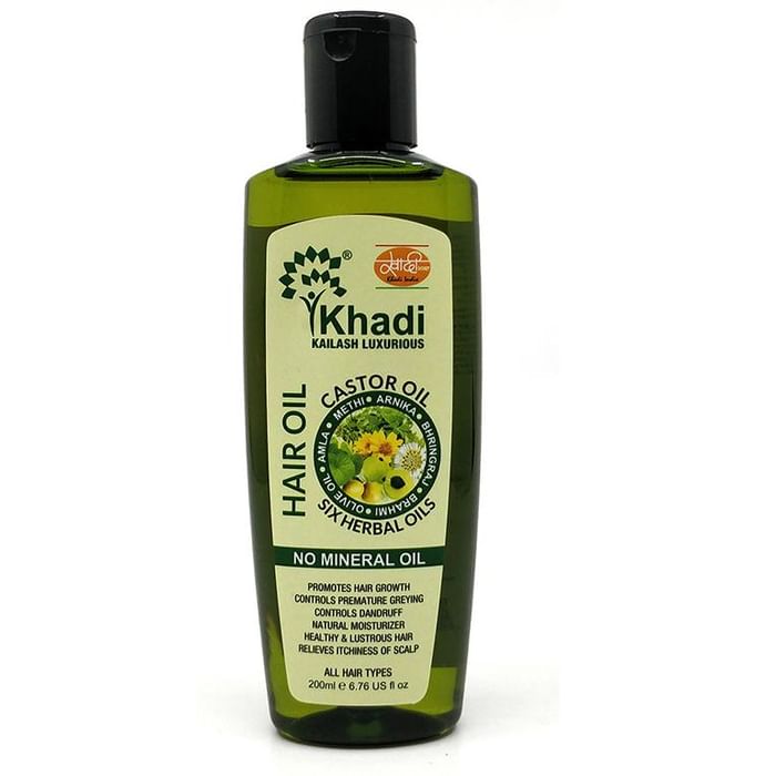 Khadi Kailash Luxurious Six Herbal Hair Oil It helps make the hair strong from the roots and facilitates hair growth to give stronger, longer, thicker hair. It is a beneficial product for scalp health, and amla has been traditionally used as a hair tonic | Key Ingredients: Castor oil | Key Benefits: Castor oil has antifungal properties and may help fight off the fungus It may also help manage denture-related stomatitis; a painful condition thought to be caused by Candida overgrowth It might benefit those who experience dandruff | Directions For Use: Use as directed on the label or as advised by your healthcare provider | Safety Information: Read the label carefully before use Store in a cool and dry place away from direct sunlight Keep out of reach of children