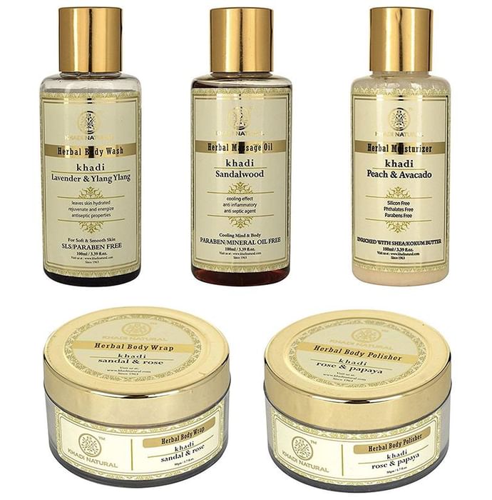 Khadi Naturals Ayurvedic Luxury Spa Kit contains natural and ayurvedic products which provide a luxurious spa like experience at home. It helps in nourishing and rejuvenating the skin. It helps in reducing blemishes, wrinkles and makes the skin healthy and glowing. | Key Ingredients: Lavender & Ylang Ylang Body wash Sandalwood Massage Oil Peach & Avocado Moisturizer with Shea Kukum Butter Rose & Papaya Body Polishers Rose & Sandal Body Wrap | Key Benefits: Formulated with natural and herbal ingredients Makes the skin soft, smooth and glowing Provides nourishment to the skin Helps in reducing wrinkles and dark pigments Rejuvenates and moisturizes the skin Helps in reducing stress, tension and provides relaxation Free from SLS, paraben and mineral oil | Directions For Use Read the label for usage instructions. | Safety Information: Read the label carefully before use Keep away from children For external use only Store in a cool and dry place Discontinue in case of irritation or allergy