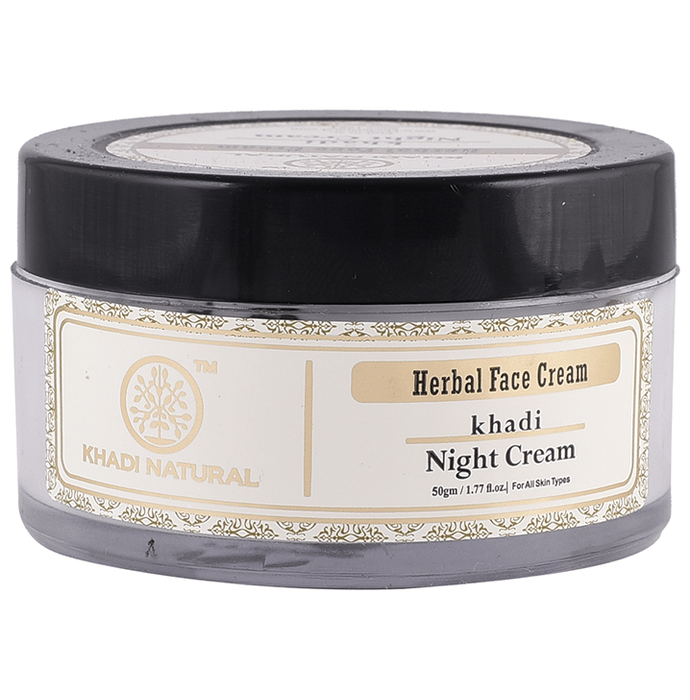 Khadi Naturals Ayurvedic Night Cream enhances circulation for greater oxygenation to the skin extremities, improves nutrient in take, redefines skin clarity, revitalizes facial skin. | Key Ingredients: Apple extract Green tea extract Rose water Olive oil Citrus limon Almond oil Wheatgerm oil Licorice Aloevera extract Ashwagandha Turmeric | Key Benefits: Regular use of the night cream, which is enriched with the amazing extracts helps to moisturize the skin Aloe vera together with almond oil not only nourishes the skin but also promotes hydration The night cream also improves the overall skin health and radiance | Directions For Use: Apply the cream over face and neck. Gently massage and leave the cream. | Safety Information: Read the label carefully before use Do not exceed the recommended dose Keep out of the reach of children Store in cool and dry place Should be protected from direct light