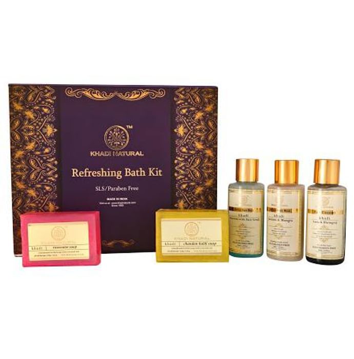 Khadi Naturals Ayurvedic Refreshing Bath Kit Khadi Naturals Ayurvedic Refreshing Bath Kit is designed with 5 all natural products. These products aims to facilitate a refreshing bathing experience. The kit features Amla & Bhringraj Hair Cleanser, Jasmine & Mogra Body Wash, Aloevera Face Wash, Rosewater Soap, and Chandan Haldi Soap.