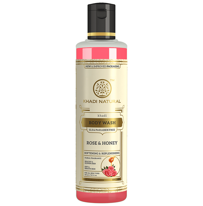 Khadi Naturals Rose & Honey SLS and Paraben Free Body Wash is a soft refreshing body wash with natural ingredients that leave the skin soft and clean. | Key Ingredients: Aloe Vera Ext (Aloe Barbadensis) Rose Ext (Rosa Damascena) Madhu (Honey) Neem Ext (Azadirachta Indica) Geranium Oil (Pelargonium Graveolens) Comfrey Ext (Symphytum Officinale) Neroli Oil (Citrus Aurantium) Curcuma Aromatic Ananas Comosus | Key Benefits: Helps in keeping the skin moist and supple Recovers healthy looking skin Leaves the skin cleansed, refreshed, and soft Helps to moisturize the skin and leaves a pleasant fragrance behind after bath Suitable for all skin types | Directions For Use: Apply to wet skin all over the body Rub into a lather & rinse Use daily if desired | Safety Information: For external use only Keep out of the reach and sight of children Avoid use if causes irritation or itching Store in a cool‚ dry and dark place Protect from the direct sunlight Keep the container tightly closed after use