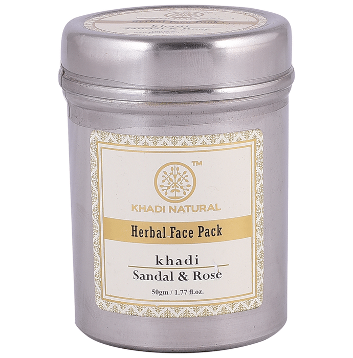Khadi Naturals Ayurvedic Sandal & Rose Face Pack It is useful in reducing scars, blackheads and pigments making the skin clean and soft. It helps to eliminate daily impurities and the effects of pollutants. Khadi face pack is useful for those suffering from dull skin as it makes the skin lustrous and glowing. | Key Ingredients: Sandal oil Basil oil Jojoba oil | Key Benefits: Helps draw out the excessive oil, cleanses thoroughly leaving the skin soft Reduces signs of ageing like wrinkles, blemishes and dark patches Its anti-septic qualities promote healthy skin, whilst brightening dull, lack of lustre skin giving it a radiant look Made of all-natural ingredients while being suitable for all skin types | Directions For Use: Use as directed on the label or as advised by your healthcare provider | Safety Information: Read the label carefully before use Store in a cool and dry place away from direct sunlight Keep out of reach of children