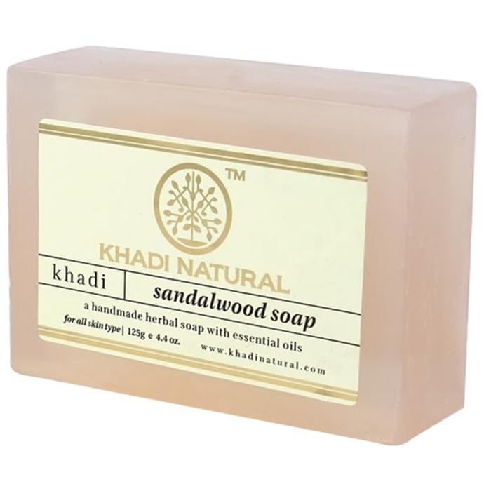 Khadi Naturals Sandalwood Soap is useful for acne, blemishes and oily skin. Leaves the skin soft and fragrant. | Key Ingredients: Sandalwood Oil Glycerine Vegetable Oils | Key Benefits: Possesses cooling, anti-septic and smoothening properties Imparts unique, woody, sweet and warm fragrance Keeps the skin away from drying and becoming too oily Helps to reduce fine lines, tighten the skin and rejuvenate skin cells Gently reduces itchiness and dryness Helps to moisturized the skin Keeps skin soft and beautiful Benefits for all skin types | Directions For Use: Apply soap on wet body and face Rub to produce lather Wash off | Safety Information: Read the label carefully before use Keep out of reach and sight of children Store the formulation in cool and dry place