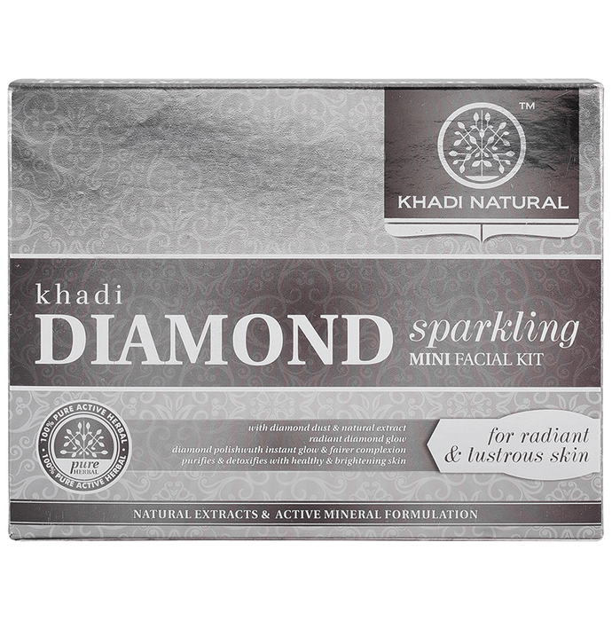 Khadi Naturals Diamond Sparkling Mini Facial Kit Khadi Naturals Facial Kit is created with the goodness of nature and adds great quality ingredients that help make skin better and gives it the radiance it deserves. It gives fair looking skin and provides a great clean up. The facial kit constitutes a Scrub, Face pack, Cleanser, Massage Cream and Gel.
