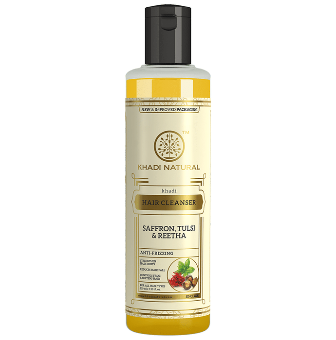 Khadi Naturals Hair Cleanser Shampoo Saffron Khadi Naturals Ayurvedic Saffron, Tulsi & Reetha Hair Cleanser is a herbal shampoo containing natural ingredients like tulsi, reetha and saffron. It not only makes the hair smooth and shiny but also encourages their growth and makes them strong and long. Made for all types of hair, it is a shampoo especially developed for women, making their hair more healthy.